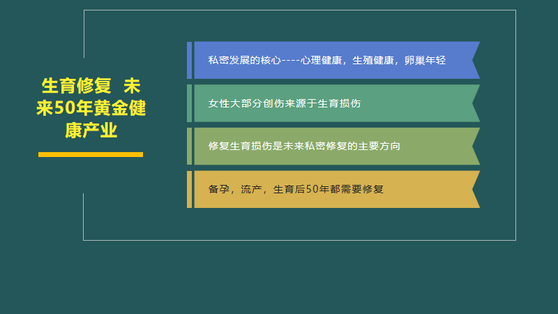 随着生育条件越来越好,明星效应的影响,这几年产后修复,月子中心已经是深入人心,以前生个孩子跟现在生个孩子的观念已经发生了很大的变化,科学的修复,从内到外让体质回归,产后迅速恢复少女身,才是现代女性的根本需求,同时众多生育后经年损伤的女性也深受困扰,“月子问题”“产后问题”伴随一生,生育修复火爆来袭,让每一个生育过后的女性都能够重获新生!生育修复是月子中心,美容院,产康转型承接的必做品相